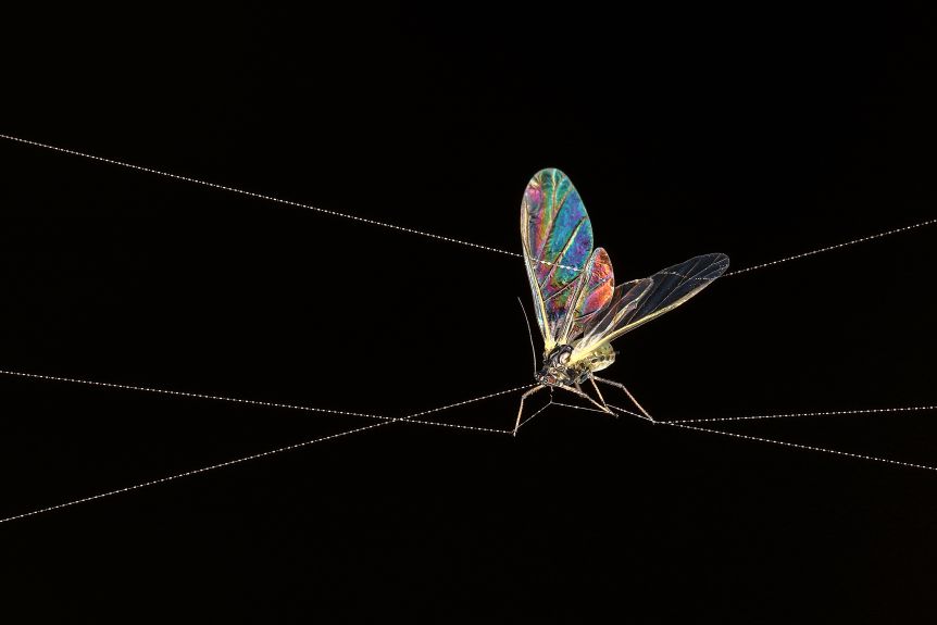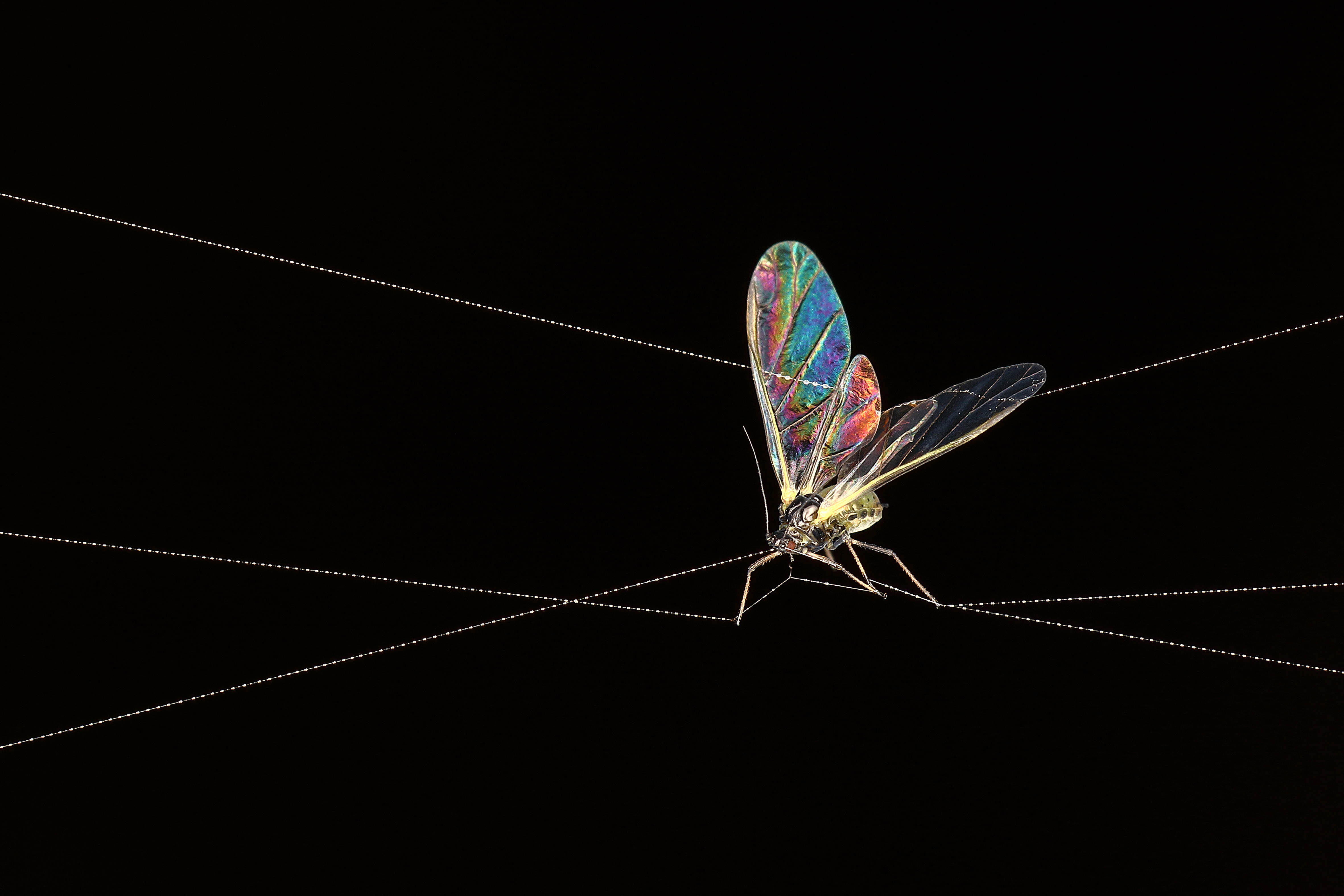De jury: “Het verdrietige lot van een bladluis in een spinnenweb is hier gevat in een prachtig beeld. De kleuren spatten van de foto af en de fenomenale scherpte laat zelfs de minuscule lijmdruppeltjes op het lijnenspel van de spindraden zien die de luis fataal zijn geworden. Mede door de pikzwarte achtergrond geeft deze foto een bijna museumachtige aanblik, maar laat ook heel mooi alle natuurlijk aspecten zien, de dunne spinrag, de vele kleurschakeringen in de vleugels van de luis en de bordeauxrode facetogen.”