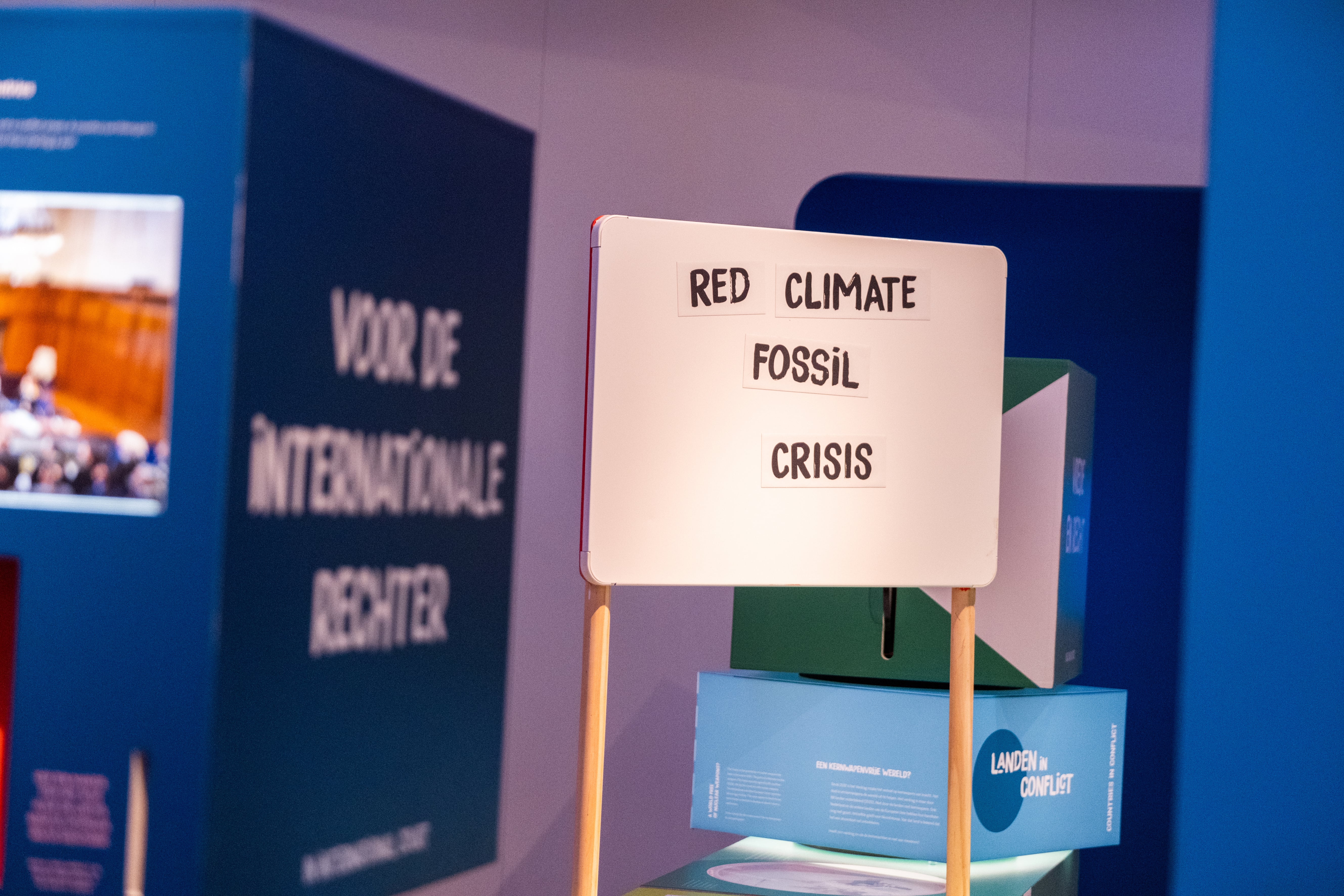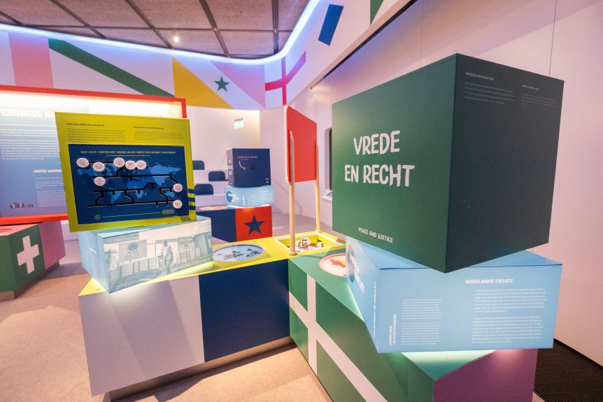 Alle informatie wordt interactief aangeboden. Bezoekers kunnen bijvoorbeeld plaatsnemen op een tribune en door middel van animaties stellingen beantwoorden. In de ‘Verhalenbank’ hoor je persoonlijke verhalen, die door het Humanity House in het kader van 75 jaar VN zijn verzameld. Online delen we alle verhalen via de website van Just Peace : https://justpeacethehague.com/theme/vn-verhalen.