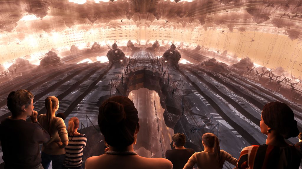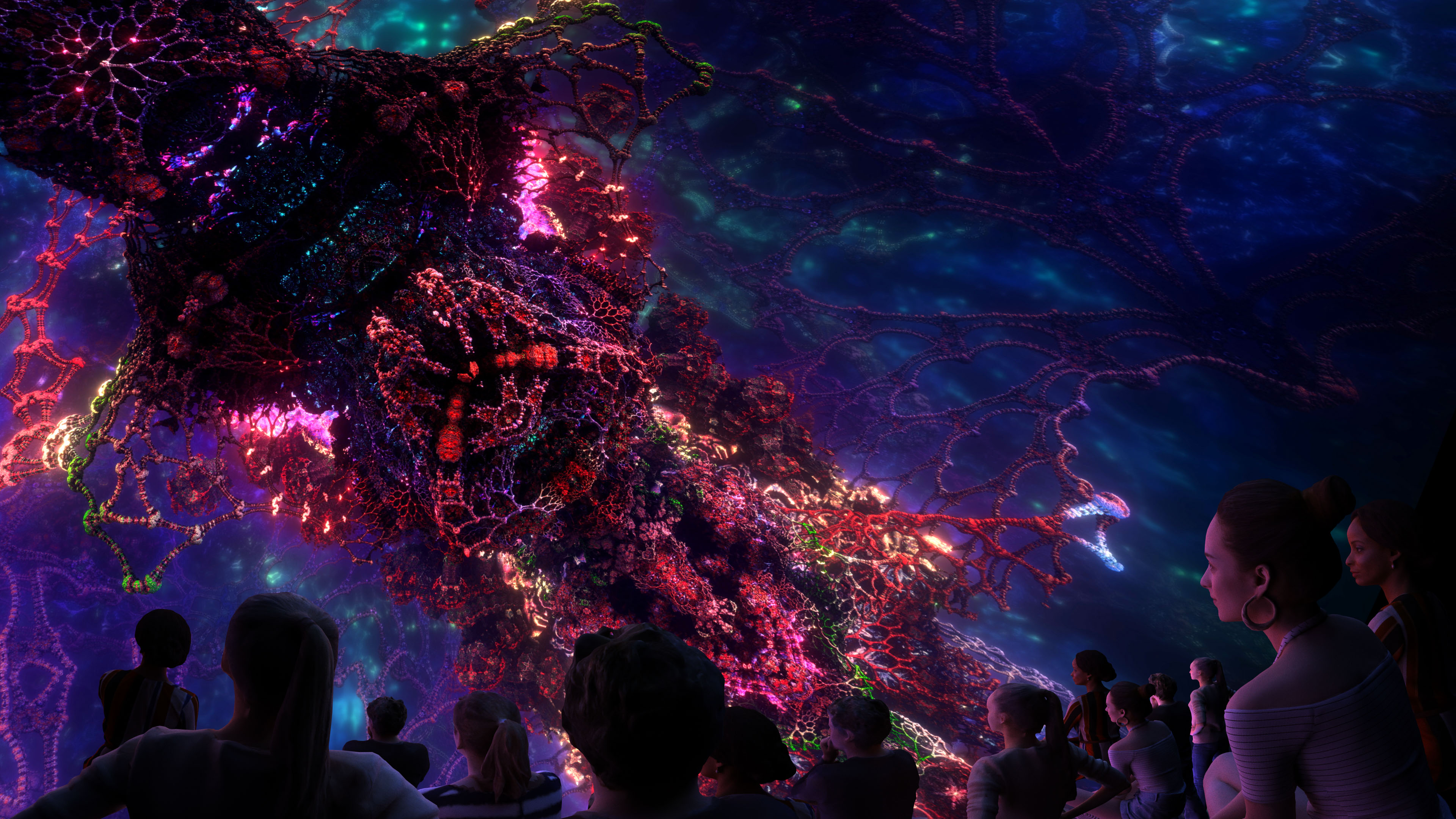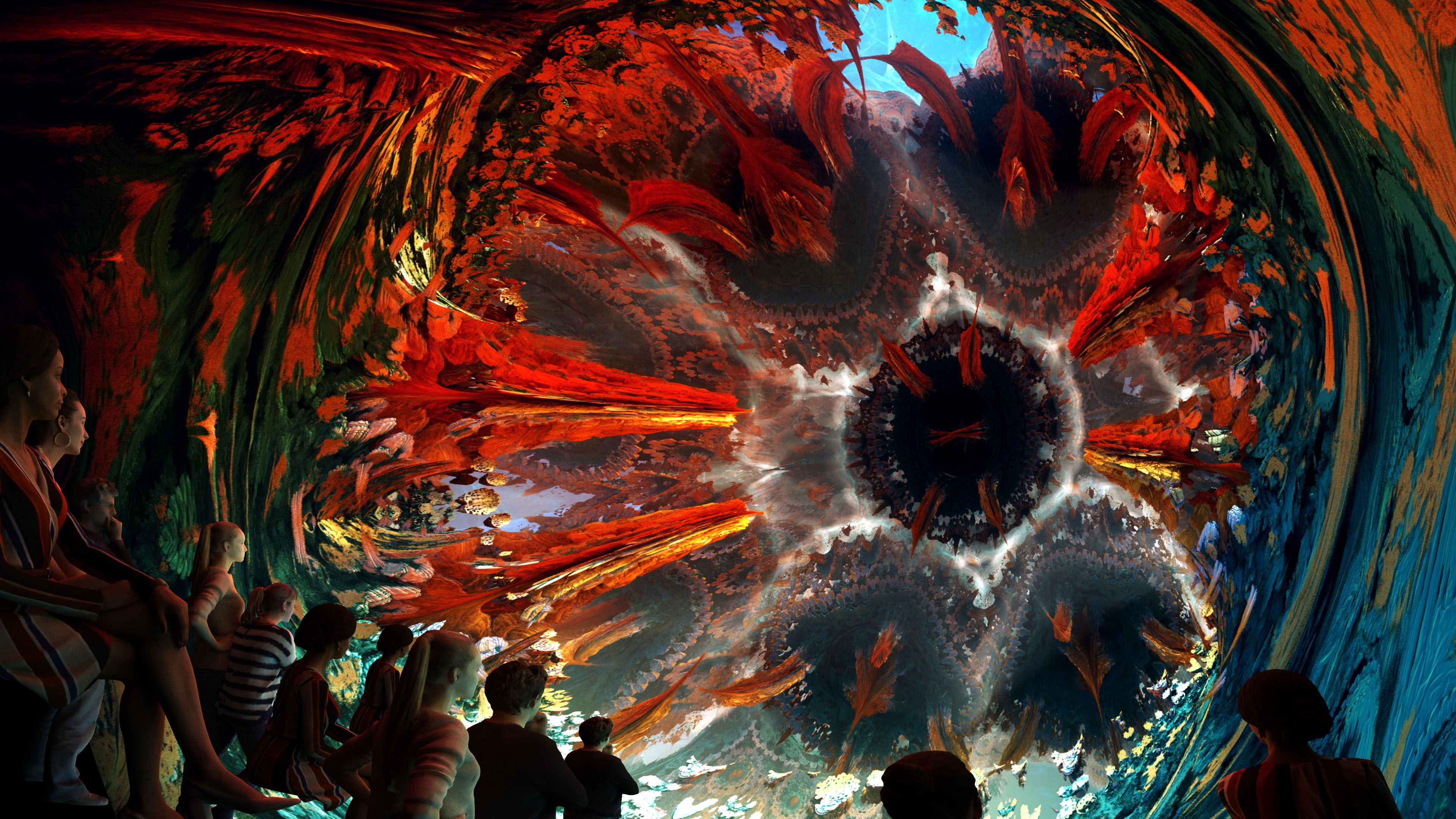 Recombinatie is een experiment over wat er gebeurt als je wat wordt gezien behandelt als wat wordt gehoord. Net zoals muziek je omhult wanneer je ernaar luistert tijdens een concert, functioneert de koepel om je onder te dompelen in de fractale werelden. De fractale werelden die ik laat zien zijn allemaal volledig gemaakt met wiskunde. Ze zijn niet ontworpen, maar eerder gevonden in een wiskundige realiteit. Het gevoel dat ik heb als ik ze ontdek – een gevoel van ontzag – is wat ik wil overbrengen op het publiek. Het muzikale gedeelte van deze show is ook erg belangrijk. Het versterkt op verschillende manieren de muzikale abstractie die ik zie, misschien op een synesthetische manier.”