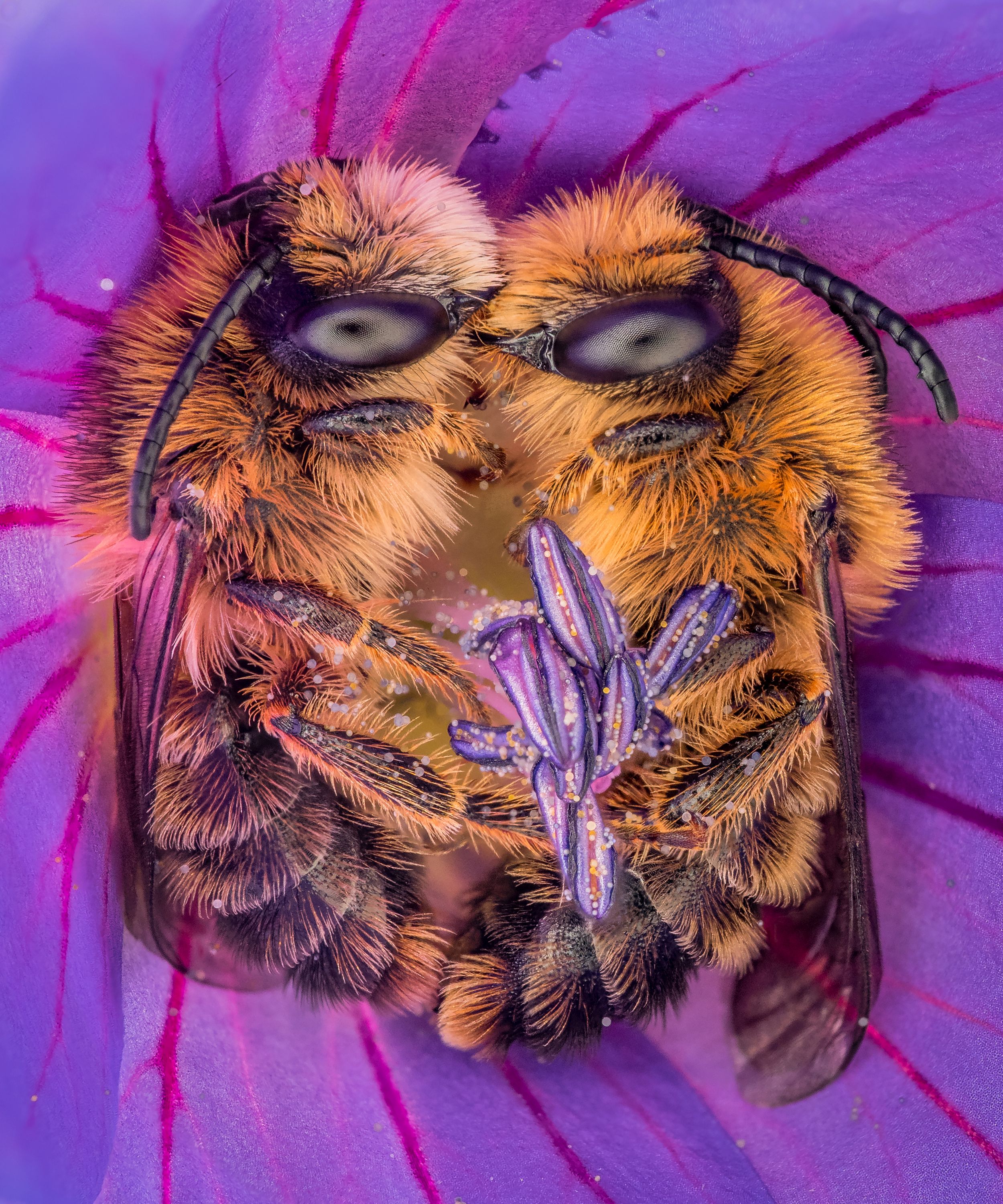 Joris Vegter is de winnaar van de categorie Geleedpotigen en ongewervelden en overall winnaar van de categorieën. De jury over deze beste natuurfoto: “Een heel intiem en uniek beeld van 2 slapende klokjesdikpoten. Deze bijtjes slapen graag in de prachtige kleurrijke bloemen van kaasjeskruid. De foto is haarscherp, een waar kleurenspektakel en geeft de bijtjes bijna iets menselijks door de knusse sfeer die is getroffen. De paarse stuifmeelkorrels op de lijfjes maken het beeld af.”