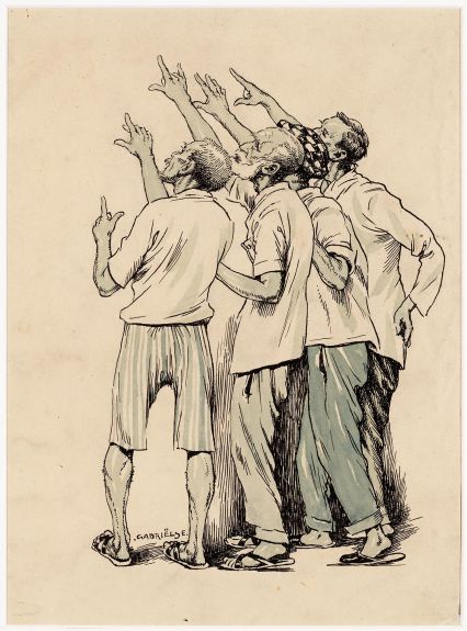 Dolf Gogelein maakte begin oktober 1945 deze tekening met de titel Indonesische Demonstratie Semarang. De Tweede Wereldoorlog is ruim zes weken voorbij. Indonesië heeft de onafhankelijkheid uitgeroepen, maar in werkelijkheid verkeert het land in een soort vacuüm waarin niemand daadwerkelijk de macht heeft, ook de Indonesische nationalisten niet. Voor hen is het daarom belangrijk om zich te laten zien. Met een stoet auto’s trekken ze door Semarang. Op de tekening staan er drie. Het meest prominent, links in beeld, is een open vrachtwagen waarop een spandoek met de tekst Repoeblik Indonesia is gespannen. De laadbak staat vol mannen in het wit, die juichen en Merdeka roepen, onafhankelijkheid. Ze zijn bewapend met iets wat op speren lijkt. Op het dak wappert een grote rood-witte vlag, net zoals op de auto die volgt: de vlag van het onafhankelijke Indonesië. De derde auto met een rood-witte vlag op de motorkop is maar net zichtbaar. Er staan wat toeschouwers langs de weg, niet erg veel. Indonesiërs. Je kunt je voorstellen dat westerlingen zich gedeisd hielden.
