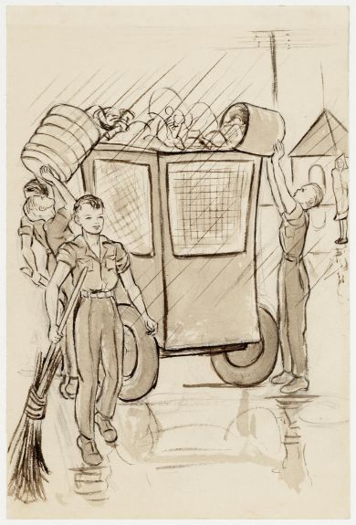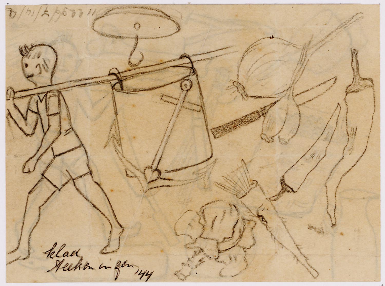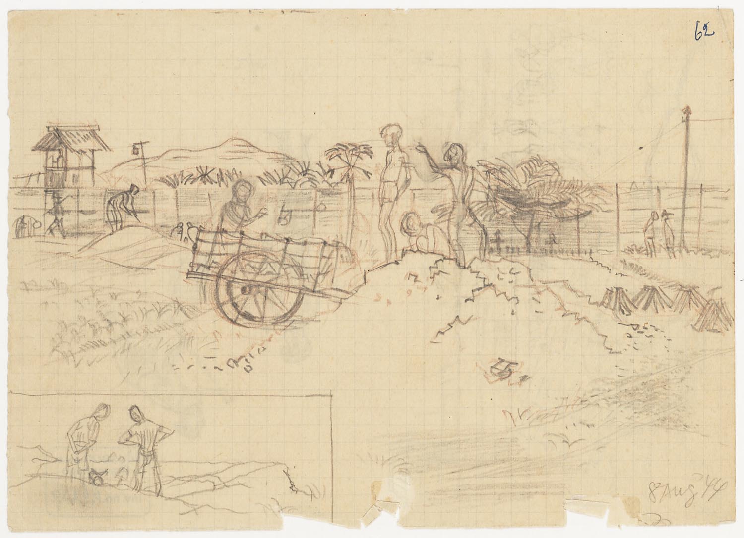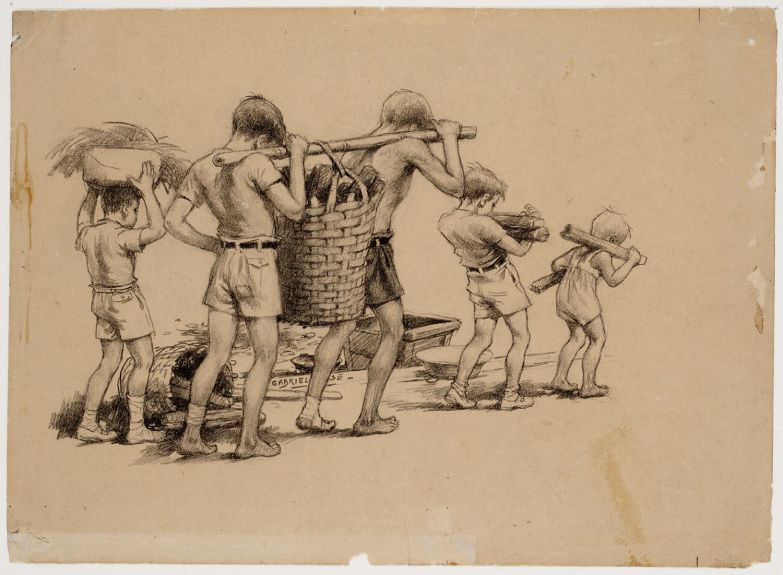 Kees van Willigen heeft hier een stoet dwangarbeiders getekend op weg naar hun werk aan de Birmaspoorweg. Hun blikken zijn leeg en ze kijken strak voor zich uit. De twee voorste mannen lopen met ontbloot bovenlijf. Hierdoor zie je duidelijk hoe zeer ze zijn vermagerd. Je kunt hun ribben tellen. De een draagt een pikhouweel over de schouder, de ander een schep. Allebei hebben ze een ketting met hun kampnummer om. Ze worden gevolgd door drie andere dwangarbeiders. Een van hen, met een officierspet op het hoofd, is duidelijk ouder dan de anderen. Een bewaker, waarschijnlijk Koreaans, sluit de rij. Op de achtergrond suggereert de tekenaar een aantal kruizen. Passeert de groep een begraafplaats van dwangarbeiders die aan de ontberingen zijn bezweken?