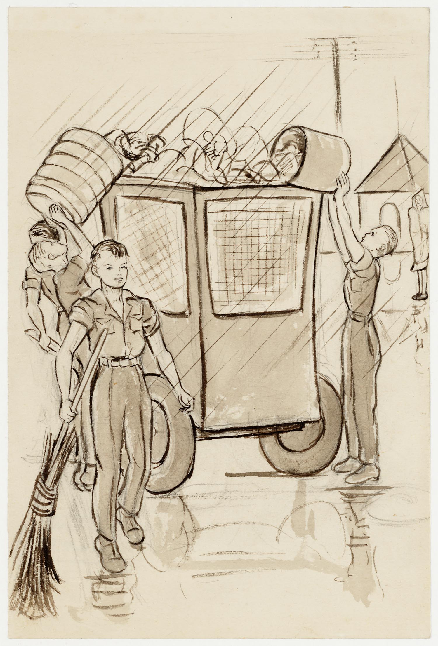 Deze tekening is gemaakt door Kees van Willigen, die als dwangarbeider aan de Thai-Birma spoorweg werkte. Hij laat hier zien hoe zwaar dat werk was. De spoorrails lopen door een diep tracé dat met behulp van pikhouwelen en scheppen met de hand is uitgegraven. Nu nog wordt er aan de wand langs het tracé gewerkt door twee mannen met pikhouwelen. Iets verderop zijn mannen met scheppen bij de tracéwand in de weer. Ook zijn er mensen met het spoor zelf bezig. Om de zoveel meter staat een bewaker, zowel op als naast het tracé, waar je via ladders kunt komen. Je herkent ze aan hun wapen of gewoon omdat het de enige mannen zijn die recht overeind staan. Verderop zie je mannen dingen sjouwen en aan elkaar doorgeven. Misschien zijn het wel de bielzen die ze zelf hebben gemaakt van de bomen langs het tracé. Je ziet dat de spoorweg niet door professionals wordt aangelegd en dat het een haastklus is. De bielzen liggen schots en scheef en de rails lopen niet mooi strak.