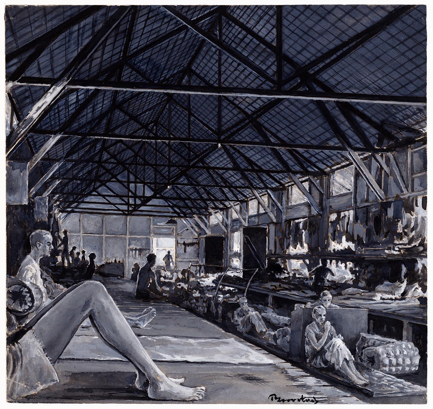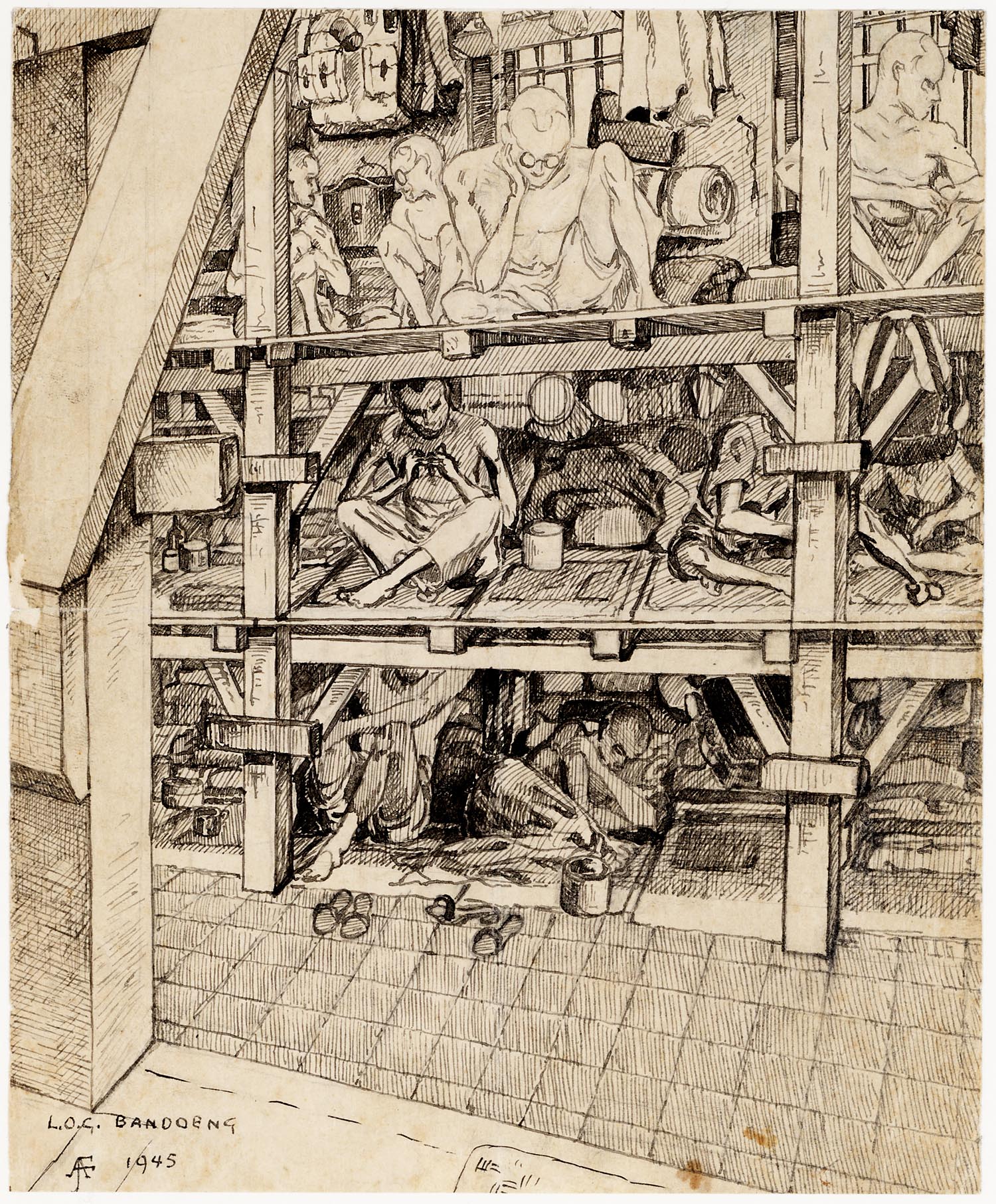 Deze tekening is gemaakt door A.M. Steensma in vrouwenkamp Kampong Makassar in Batavia, het huidige Jakarta. Het stelt een stukje van een barak voor, opgetrokken uit bamboe en riet. Afgebeeld zijn vijf vrouwen naast elkaar op hun slaapplaats. De vrouw links zit rechtop en kijkt afwezig voor zich uit, tussen haar vingers smeult een sigaret. De vrouw naast haar ligt op haar rug te lezen. De anderen slapen. De meest rechtse heeft zich op haar zij gedraaid, zo ver mogelijk van de anderen vandaan, misschien wel op zoek naar een beetje meer ruimte voor zichzelf. Want veel ruimte hebben de vrouwen niet. Niet meer dan de breedte van hun matras, een centimeter of tachtig. Hoezo privacy? Hoeveel vrouwen in deze barak wonen, weten we niet. In elk geval meer dan deze vijf, want rechts liggen nog twee matrassen.