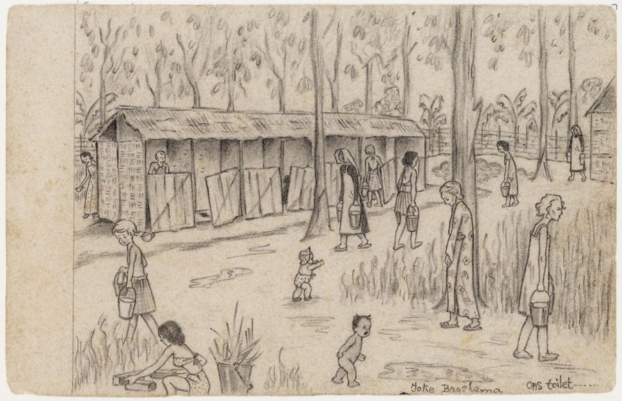 Ons toilet heet deze tekening die Joke Broekema in vrouwenkamp Aek Pamienke heeft gemaakt. Het tafereel straalt complete onttakeling uit. Het toiletgebouwtje is opgetrokken uit bamboe en riet. Het is over een goot heen geplaatst en bestaat uit 2 maal 7 toilethokjes met twee planken in het midden; is de sloot vol, dan moeten de bewoners van het kamp een nieuwe goot graven en verhuist het gebouwtje, zo weten we dankzij een verslag van Claasje Duin-Rietdijk, die als kind ook in dit kamp zat. In het begin zaten nog klapdeurtjes in de hokjes, zo weten we uit hetzelfde verslag, maar inmiddels komt de enige privacy van de schotten die je voor de ingang kunt zetten als je het toilet gebruikt.