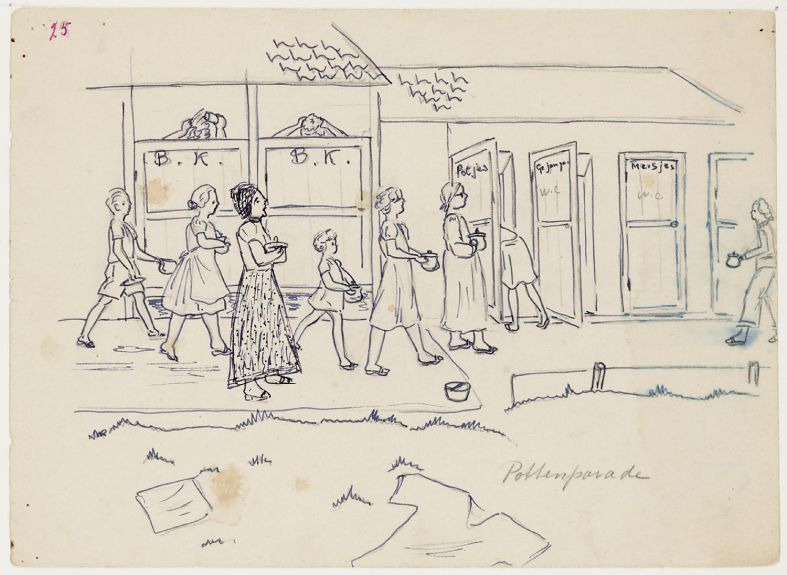 Het is een typische kampscène. Er is een verslag van Gerard Weijers die als jonge jongen in hetzelfde kamp zat, het Kampement 4de + 9de Bataljon in Tjimahi: ‘