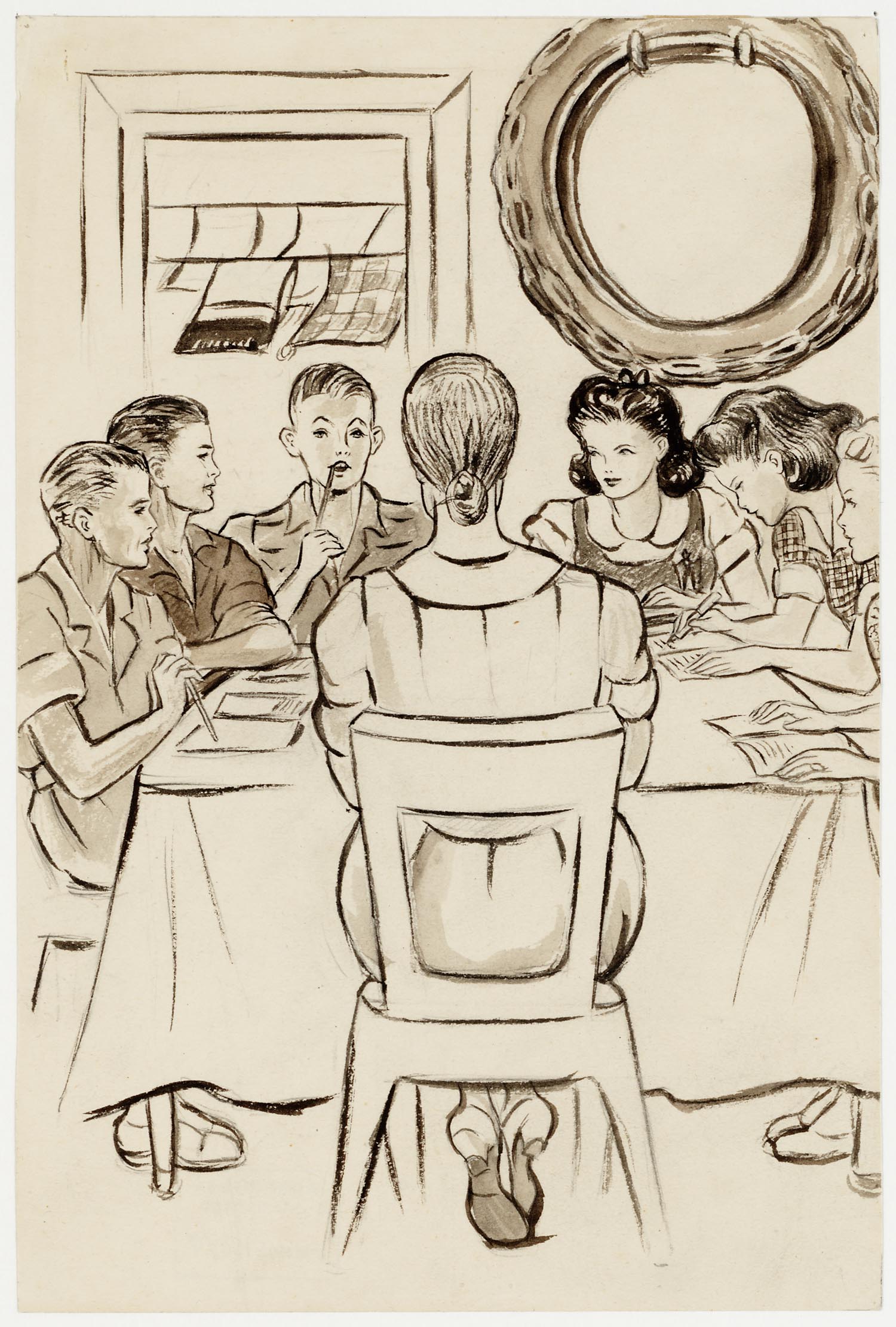 Deze tekening werd gemaakt door Molly Roukens, die als tiener in een vrouwenkamp op Celebes zat. School in de keuken heeft ze hem genoemd. Een aantal jongens en meisjes zit met pennen en schriften aan een tafel. De onderwijzeres zit aan het hoofd van de tafel. Langs de wanden bevindt zich een soort werkblad met kook- en eetgerei. Erboven is de barak open. Buiten hangt was te drogen – over de omheining rond het kamp? Voor de ingang van de barak ligt een stapel wasgoed bij een teil en een emmer. Op de achtergrond een vulkaan.