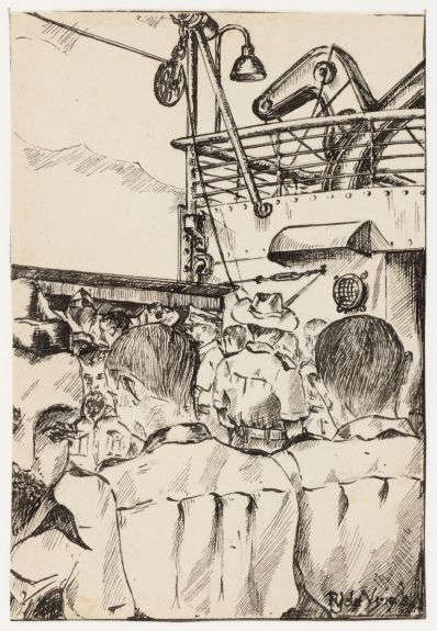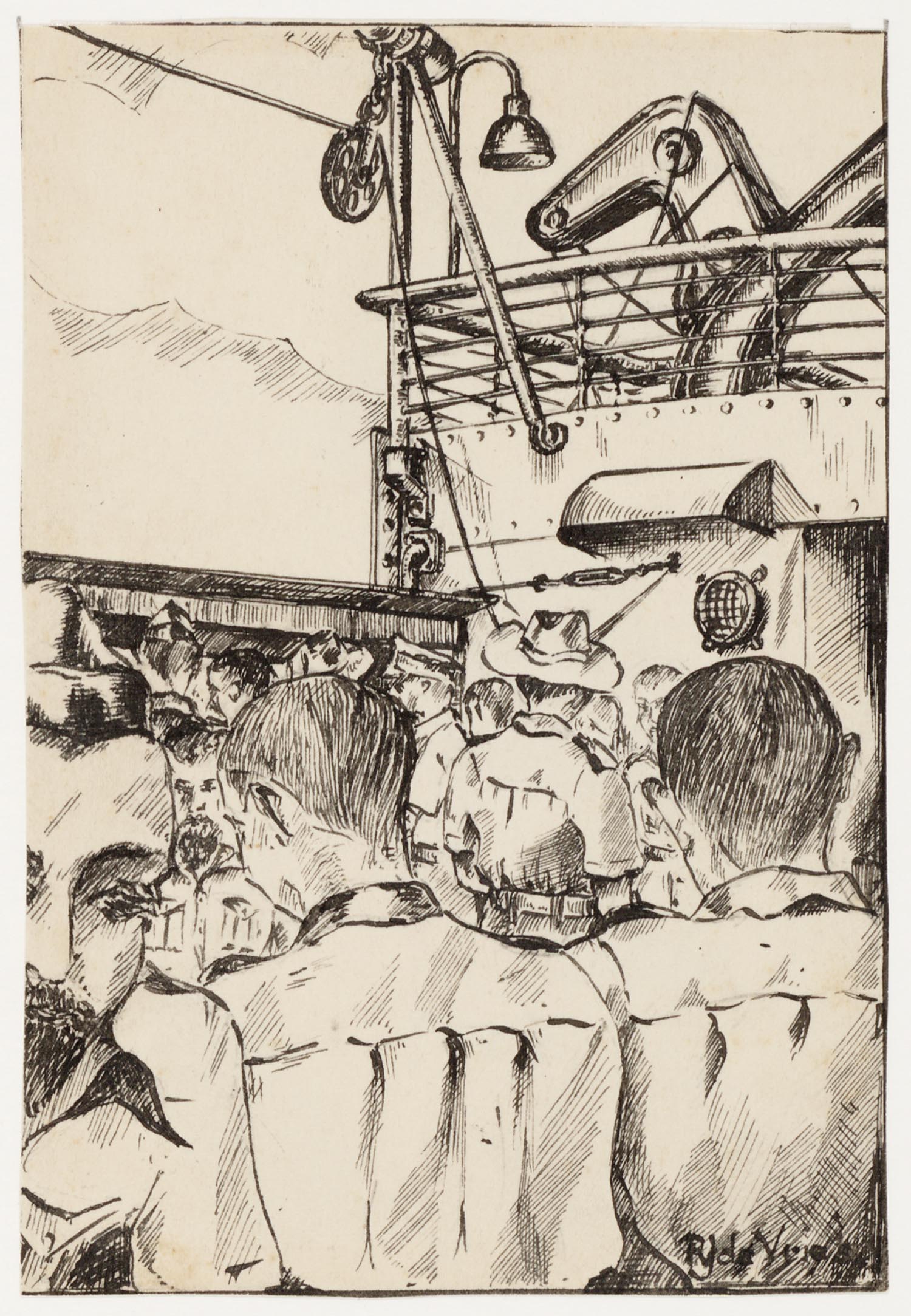 Romke de Vries werd als krijgsgevangene per schip naar Japan gebracht. Deze tekening heeft hij in oktober 1942 aan wal gemaakt, in Singapore, maar de tekenaar brengt de benauwdheid over die hij onderweg voelde. Hij bevindt zich in het scheepsruim. Je kunt niet eens zien of zijn medepassagiers zitten, liggen of staan, zo vol is het. Een steile trap leidt naar een soort balkon. Ook daar zie je alleen maar mensen. Nog een balkon, ook zo vol.