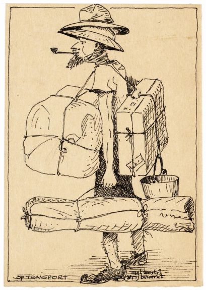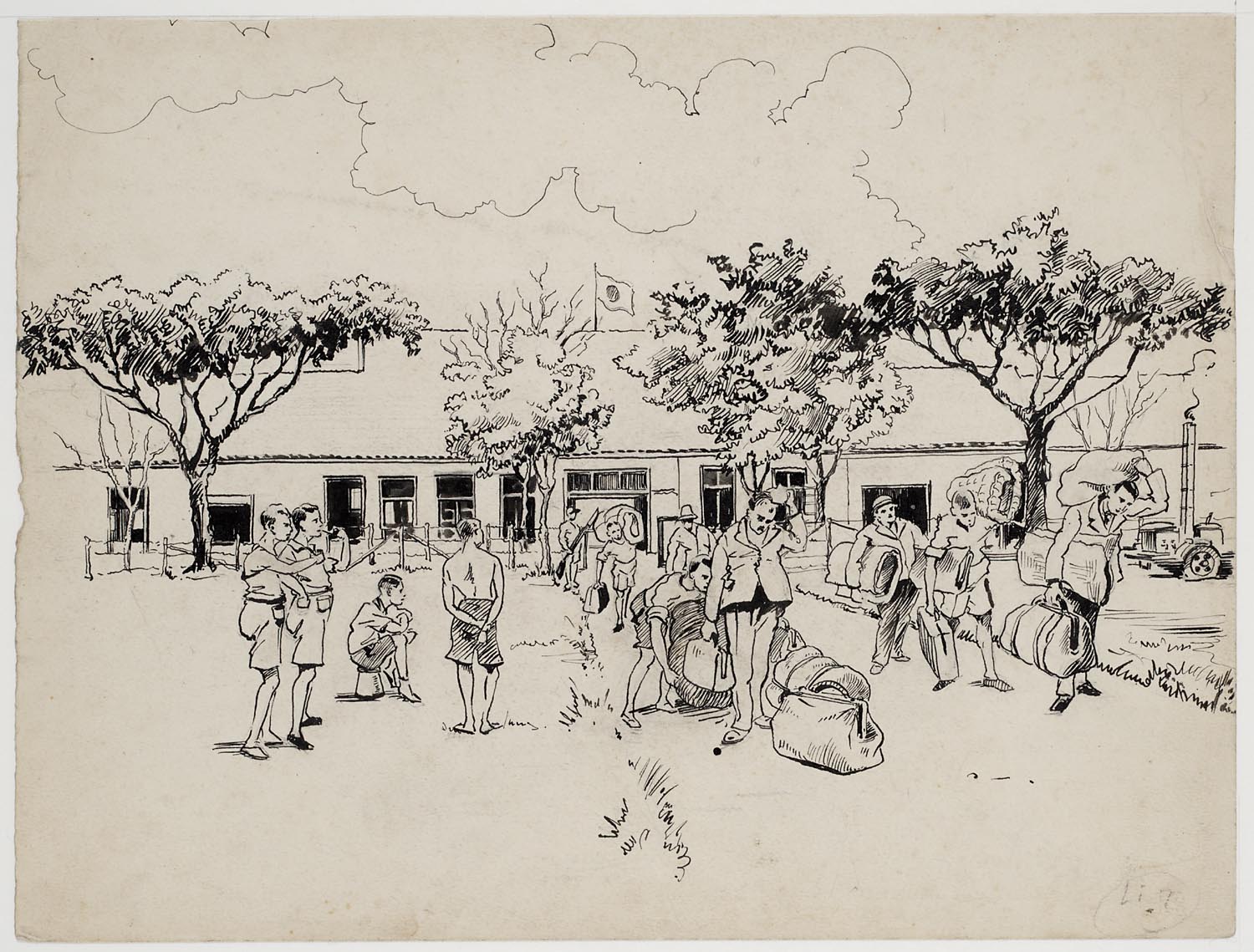Dit tafereel werd kort na de overgave van het KNIL door Romke de Vries getekend. De militairen zijn krijgsgevangen gemaakt. Te zien is de laadbak van een vrachtwagen die vol staat met mannen in uniform. Hoewel er een gewapende Japanse bewaker tussen staat, fietst er een vrouw met de vrachtwagen mee, die een van de gevangenen iets aanreikt. De tekenaar zelf geeft een toelichting bij dit tafereel: