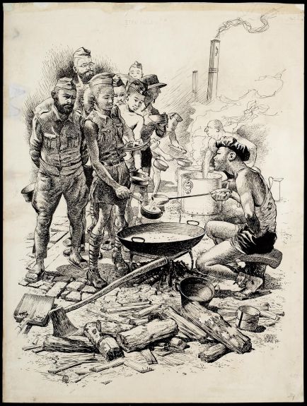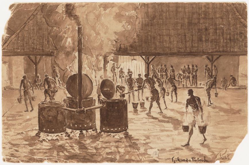 Heet water halen voor koffie of thee heet deze tekening van Gerrit Post. Het is een in bruine inkt opgezette scène in mannenkamp Tjikoedapateuh op Java. Het meest in het oog springen drie enorme, hout gestookte ketels links op de voorgrond. Stoom stijgt op uit twee ketels waarvan het deksel openstaat. Een man schept water uit een van die ketels. Om zichzelf tegen de hitte te beschermen doet hij dat met behulp van een emmer die aan een lange stok is bevestigd.