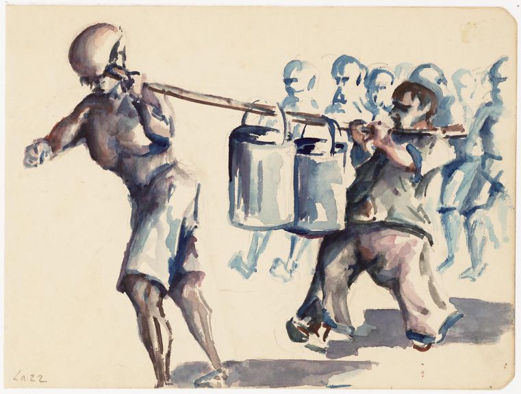 Elders sjouwen mannen met emmers dampend, anderen hebben in afwachting van hun beurt hun emmer op de grond gezet. Op de galerij van een woonbarak op de achtergrond een groot aantal mannen.