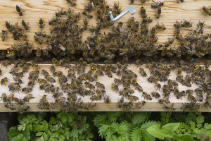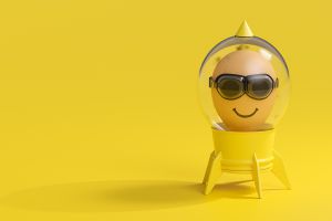 Een man en een vrouw met zwevend fruit in een cockpit.